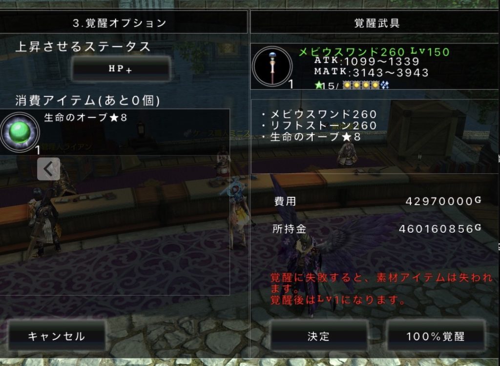 武具を覚醒するときは、装備の進化と同様で失敗することがあり得るのです・・。