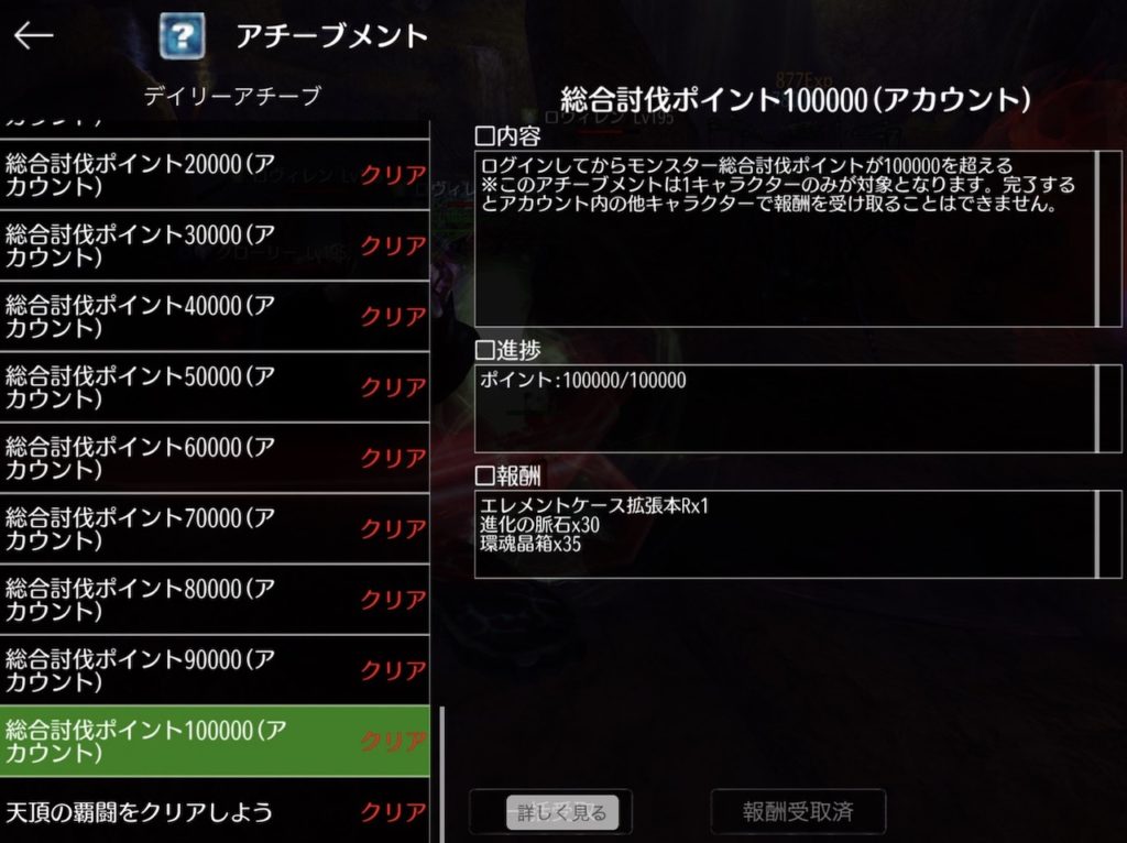 で、具体的にはどんなことをするのかというと、デイリーアチーブメントでお金を稼ぐには毎日10万ポイント分モンスター討伐することが条件になります。