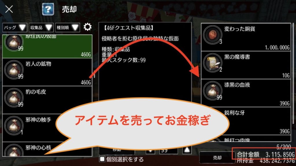魂晶については、自分の武具に埋め込んだほうが良いんじゃないか?って思うかもしれないですが、低階層で取得できる魂晶を埋め込む理由はほぼありません。じゃんじゃん売ってお金を稼いだ方が、効率よくゲームを進めることにつながります。
