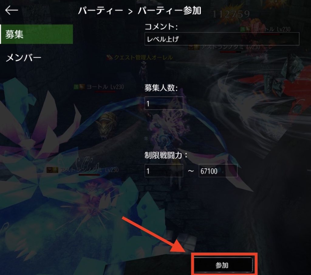 募集人数と制限戦闘力を確認したら、赤枠部分の「参加」をタップしましょう。