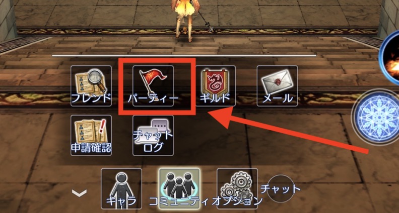まずは、画面下部分にある「コミュニティ」から「パーティー」を選びます。