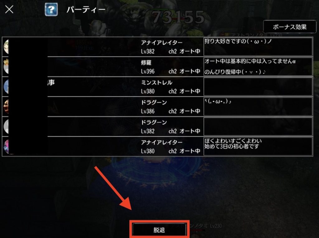 その一覧の一番下に脱退とあるので、脱退をタップすると参加しているパーティーから脱退することができます。