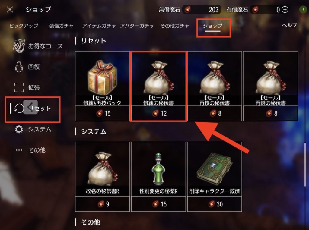 振り分けたステータスをリセットするには?:ショップで修練の秘伝書は買える