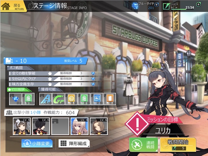また、ステージ情報ではステージに登場するボス戦闘についてと、出陣する小隊の編成を組んだりしてバトルに挑みます。