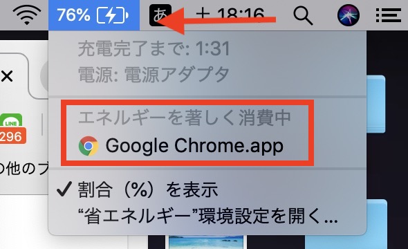 画像ではGoogle Chromeがたくさんの電力を消費中と書かれていますね。