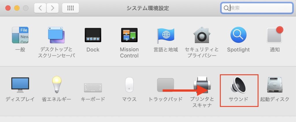すると、上のような画面になるので赤枠部分「サウンド」をクリックして開きます。
