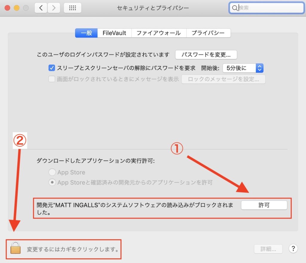 上の画面のように「許可」をクリックしたら、画面左下にあるカギをクリックしてMacのパスワードを入力するとアプリのインストールを許可することができます。