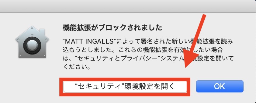 許可するためには、赤枠部分「セキュリティ環境設定を開く」をクリックして、設定を変更していきます。