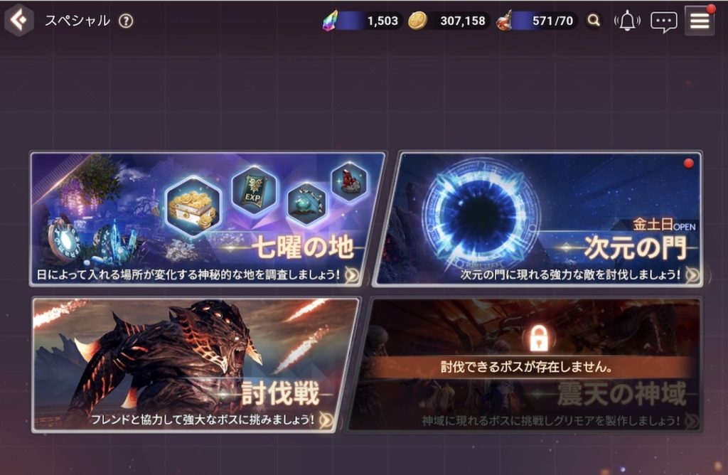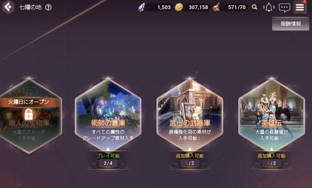 曜日ごとにダンジョンの内容が変わるというもので、経験値だけでなく各種強化素材を大量に入手することができます。