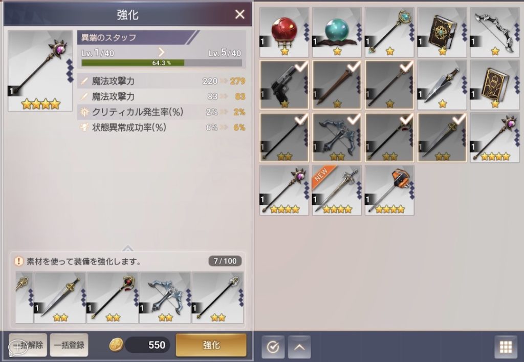 装備品の強化も専用の素材を使うか、不要な装備を素材にすることで強化していきます。