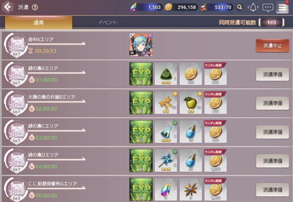 派遣はキャラクターを選んで、決められた時間まで待つというスタイルなので、ご飯前とかお風呂の前とかに派遣しておくと良いでしょう!