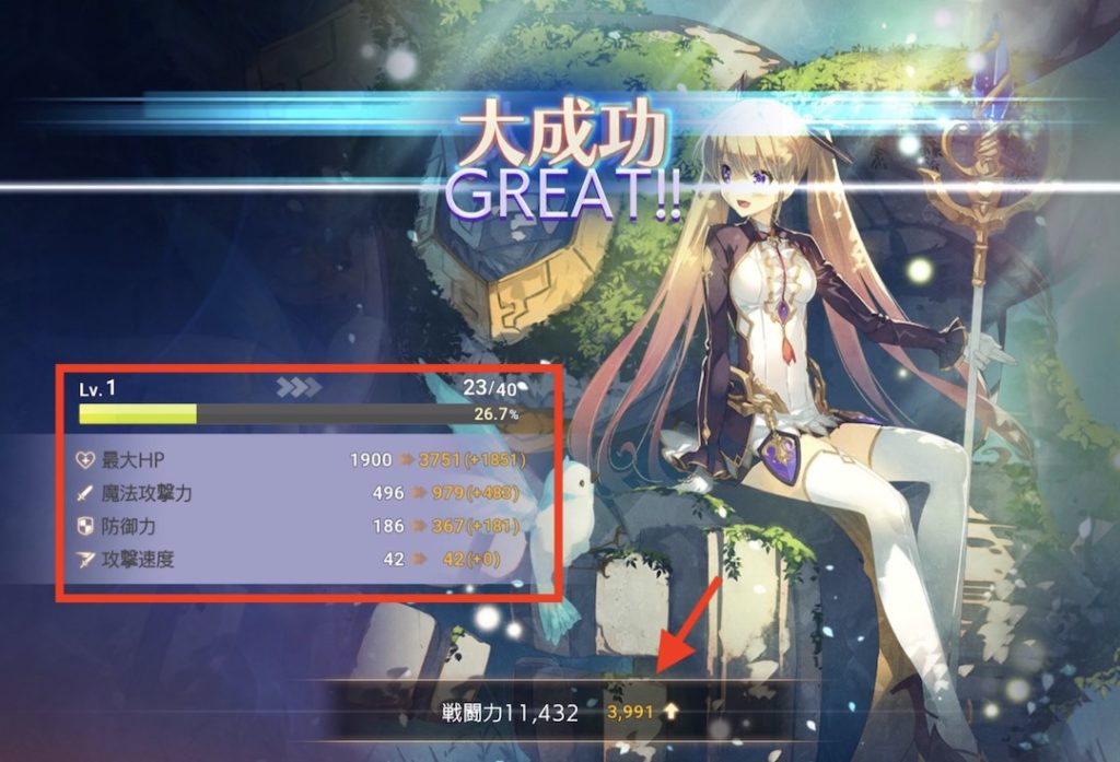 強化すると、赤枠部分のようにキャラクターのステータスが上昇します。