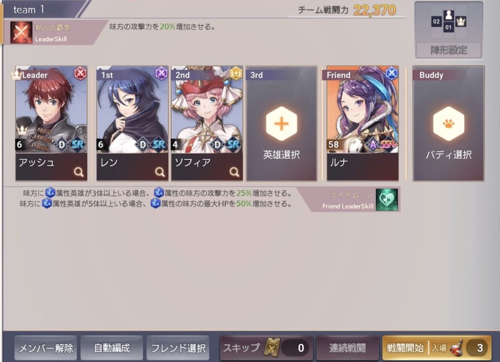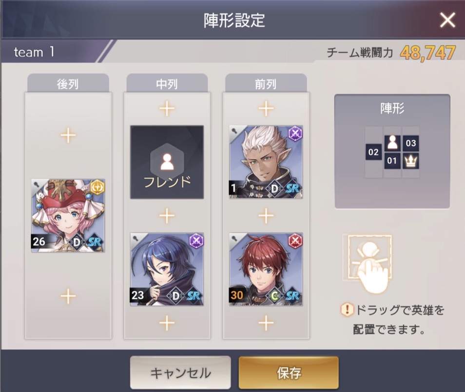 体力のあるキャラクターを前列に配置したり、体力の低いヒーラーは後ろに配置したりして戦略を練っていきます。