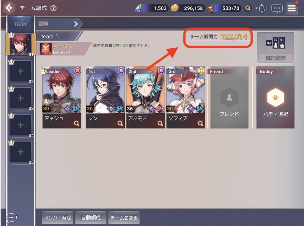 編成チームそれぞれのキャラクターを強化して行くことで、総合的な戦闘力も大幅にアップするので、「敵に勝てないなー」と思ったらキャラクターを強化していってくださいね。